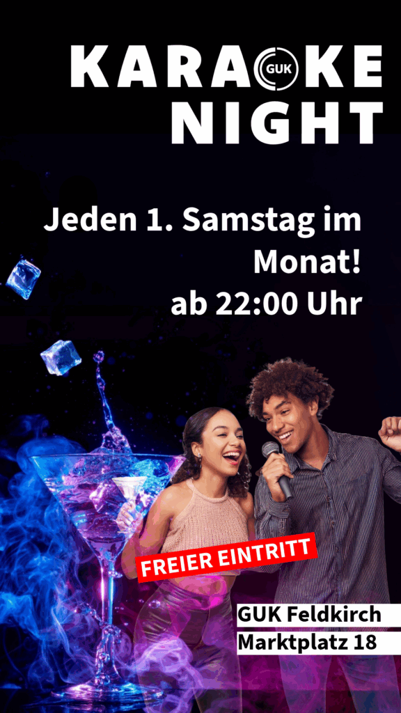 Mach dich bereit für unvergessliche Nächte voller Musik, Spaß und großartiger Vibes! Unsere Karaoke Night im GUK Feldkirch ist der perfekte Treffpunkt für alle, die gerne singen – egal ob du Profi bist oder einfach nur Spaß haben willst.